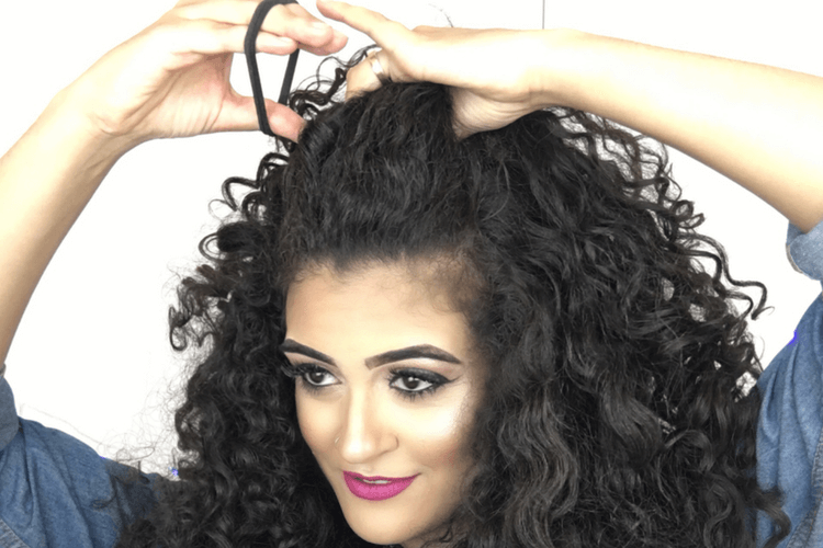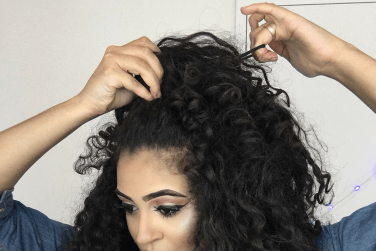 Ao mesmo tempo você puxa o seu cabelo para cima, até a metade ...